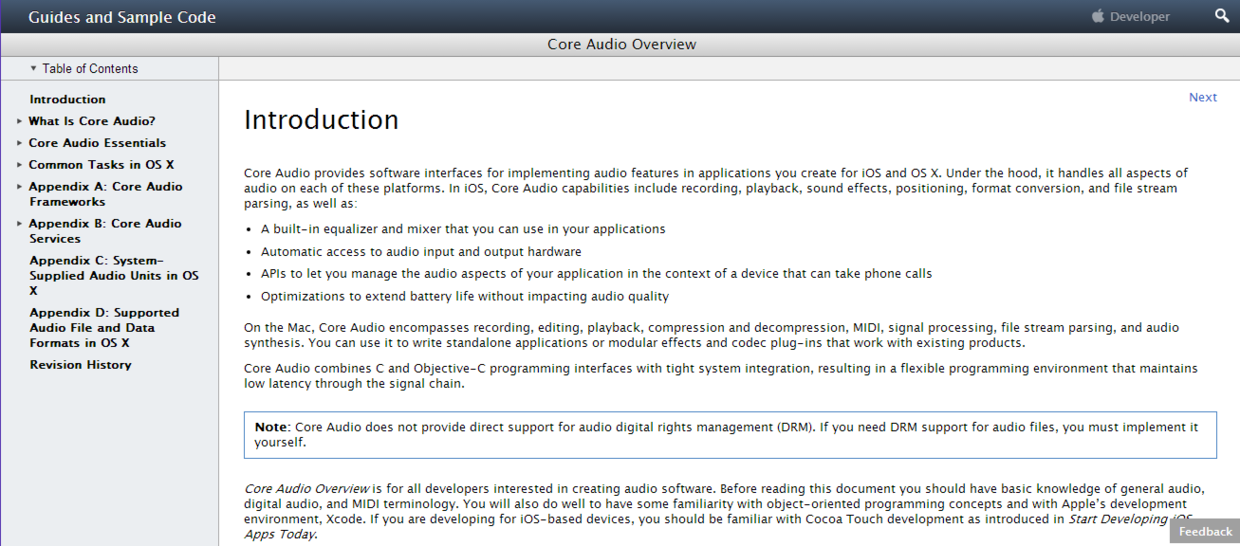 link:https://developer.apple.com/library/content/documentation/MusicAudio/Conceptual/CoreAudioOverview/Introduction/Introduction.html
